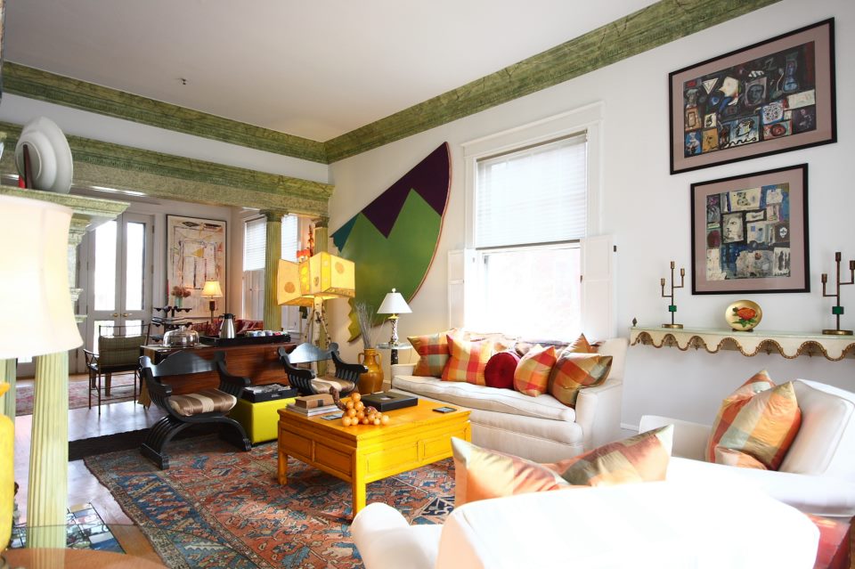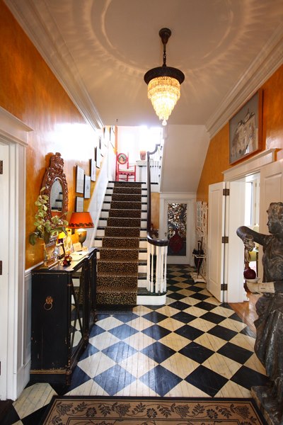 Downstairs public rooms include front-to-back living and dining rooms, each with a fireplace and each with all sorts of intriguing accent pieces. Color is rampant throughout: This isn’t a place for the color shy.