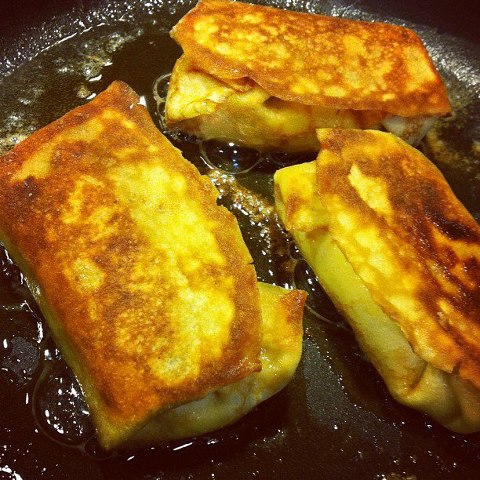Put the squash, Ricotta, cottage cheese, egg yolk and salt in food processor and mix until very smooth. Place 2 tablespoons of the filling in the center of each crepe.Add 1 tablespoon of the zucchini and onion mixture and fold in each side, creating small square pouches.Place seam side down onto a parchment lined rimmed baking sheet. Repeat with the remaining crepes. Cover and bake the crepes for 20 minutes until puffed.Uncover and cook for another 5 minutes. (Alternatively, you could pan fry them in butter and olive oil until lightly browned on each side and then place in oven for 10 minutes to finish