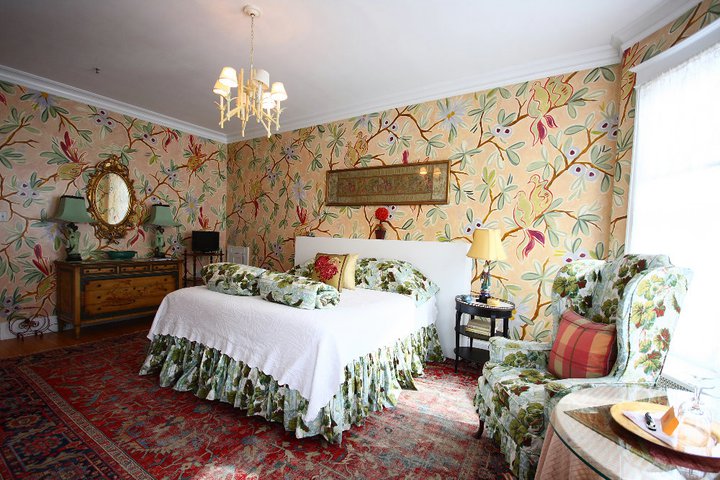 I checked into Room 4, which reminded me of an English manor house inn. It was spacious, decorated with a mix of art and antiques, had a gas-fired fireplace, small flat-screen TV, and a seating area with two wingback chairs. What I loved most were the hand-painted walls, with a branch motif and lovebirds. Bedding with rich and comfy. The bathroom small but had everything necessary, right down to a nightlight.